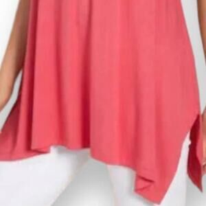 Options are unlimited with this easy, flattering top that flows from the scoop neckline in a gorgeous drape to a curved shark bite handkerchief hem with side slits. Fabric & Care- Washable very soft stretch 95% viscose 5% spandex jersey knit blend. Color of the stock photos is a better representation of the shade than my photos. My photos appear more pink than coral. Approximate measurements taken with item laying flat & without stretching