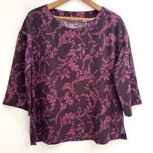 Soft Surroundings Blouse Top Womens Selina Wine Botanical Brown/Plum Purple Pink Leafy Vine Print Medium. 3/4 length sleeves. Great quality with nice thick satin crepe material