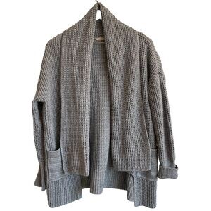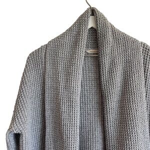 Gorgeous and cozy gray knit cardigan from Soft Surroundings. Two patch pockets on a draped front. Please note that this originally had buttons that clipped the draped pieces together- these buttons have been removed so that it's much more flowy and relaxed. Size XS.