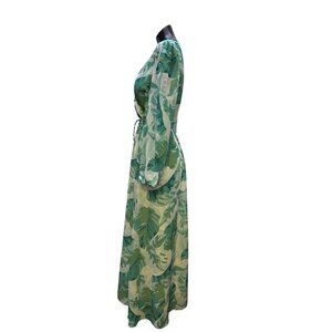 This long sleeve maxi dress offers a flattering silhouette with its wrap style and tropical leaf print. Made by Soft Surroundings, it provides a comfortable fit for any casual or semi-formal occasion. The belt detail adds a touch of elegance.