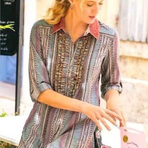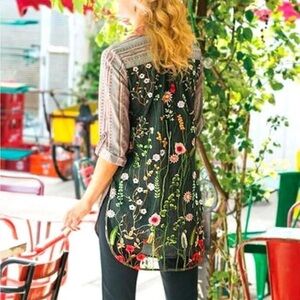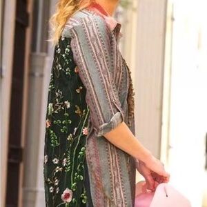 The Soft Surroundings Tunic Elena Topper in grey with a salmon color embroidered back is a stylish and comfortable addition to any woman's wardrobe. This long-sleeve blouse features a collared neckline and a casual sleeve design, perfect for everyday wear. The floral pattern adds a touch of whimsy, while the multicolor embroidery on the back adds a pop of color to the overall look. With a regular fit and XL size, this tunic is both fashionable and flattering for any occasion.