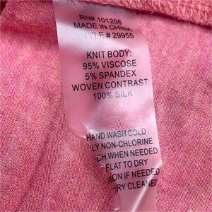 Body is a viscose & spandex blend with sections of silk fabric .Very soft, has stretch..