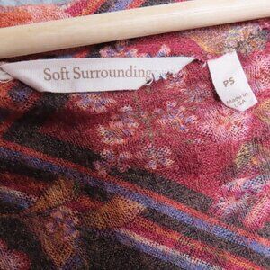 Soft Surroundings Tunic Top PS Petite Small Ribbed Floral Waffle Knit Boho Color: Red Multicolor Material: 78% Polyester / 22% Rayon Approximate Measurements:(Flat Lay) Chest (pit to pit):19.5" in Length: 28" in Sleeve length: 23" in * Great pre-owned condition * All items are carefully inspected, sealed, and inventoried after processing. * Pre-owned items have been cleaned. * Stored in a smoke free and pet free environment. * Previous washings may change the sizing; see measurements in the photos and compare to your own garments to ensure a good fit.