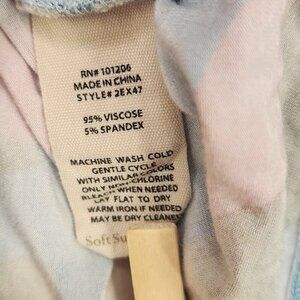 This top is in excellent condition. Clean, well cared for. Beautiful light blue with green, brown, orange and pink floral design. Stretchy.