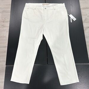 Soft Surroundings Ultimate Denim Straight Leg Jeans in Pearl Ivory Color in size 22W. New with tags. The only denim you'll want to wear. This classic straight leg style is their most beloved silhouette, made with premium four-way stretch for a comfortable and super-flattering fit. The five-pocket design sits at the natural waist and features a button and zip closure and belt loops. Faint marks from rubbing against something in shipping/handling. Will come out with washing which is recommended before use. Not noticeable unless closely inspecting. Very soft, breathable, flattering, and comfortable. Please refer to photos for exact size and condition.