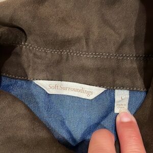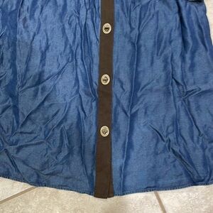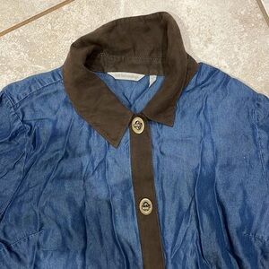 Gently worn Soft Surroundings Urbina Denim Dress womens size L. Lightweight tencel denim material, long sleeves, longer midi length, faux suede trim up front, on collar and on sleeves, turn lock clasps. Super cute! Could be worn as a lightweight jacket as well for layering. Offers accepted!