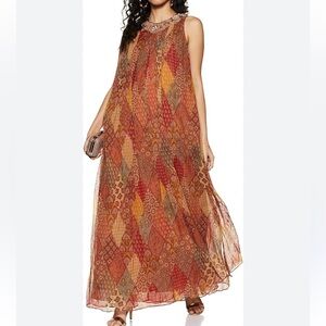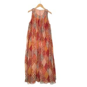 This beautiful sleeveless maxi dress features a colorful, bohemian-inspired patchwork print in warm tones of red, orange, and gold. Crafted from lightweight, semi-sheer chiffon, it offers a breezy, flowy silhouette perfect for summer days or vacations. The loose fit and relaxed style make it effortlessly elegant and comfortable to wear.
