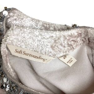 This is a gorgeous Soft Surroundings Tunic Top. Velvet with sequins detail around neckline. Ombree color from cream tan to gray. Long bell sleeves. Key hole front detail. Size XS but would also fit a size S or small. Bust 18”. Length 30”. Excellent gently used condition. Measurements are approximate and taken laying flat.