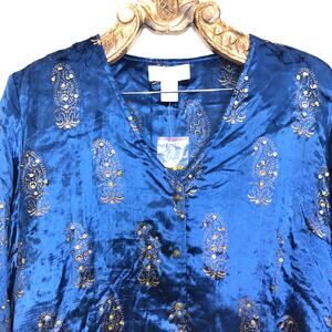 Soft Surroundings Velveteen Button Up Blouse Beaded Sequin Embroidered Blue 3X