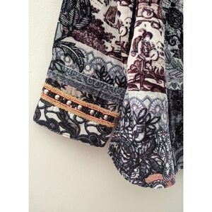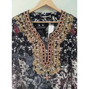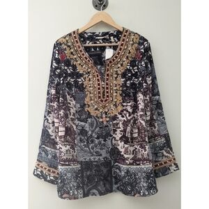 New with tags! Soft Surroundings Venetian top. Rich embroidery and beading at the neckline elevate this tunic to an utter head-turner. Designed from buttery velvet and given a modern monochromatic print, bust darts, side slits, long sleeves and two bejeweled buttons at the cuffs. Size medium.