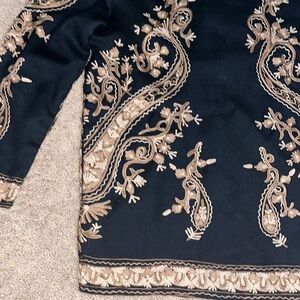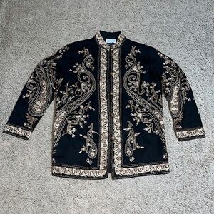 Soft Surroundings Vintage 100% Wool Floral Embroidered Jacket Cardigan Black XS. Gorgeous floral embroidered, Asian-inspired jacket / cardigan / blazer. Tunic style length. Mandarin color. Neutral colorway. Intricately embroidered button details. Extra button included. Pockets. Fully lined. 100% Wool. Approx measurements: 21“ pit to pit & 28“ length. Great pre-owned condition. No stains/flaws. Smoke/pet free home. Offers welcome. Bundle & save. Ship same/next day. Packaged w/ care.