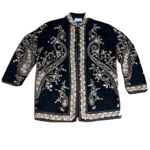 Soft Surroundings Vintage 100% Wool Floral Embroidered Jacket Cardigan Black XS