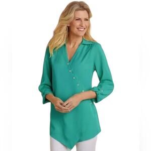 Soft Surroundings Washed Tencel Asymmetric Button Roll Tab Sleeve Tunic Top Sz L