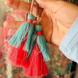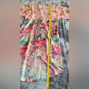 This sheer, midi-length topper has elbow length sleeves and a front tie with tassels.