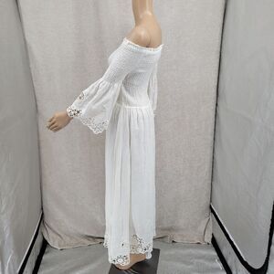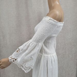 White linen dress with smocked / Shirring bodice and upper sleeves. Embroidery cutwork eyelet floral crochet Lace on sleeves and bottom hemline.