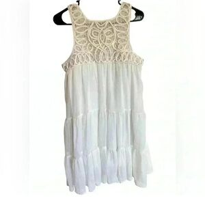 White / cream sleeveless intricate detailed sheer neckline babydoll layered boho ethereal dress. Fully lined. Skirt is white, sheer and gauzy. Bodice is cream embroidered.