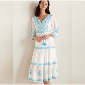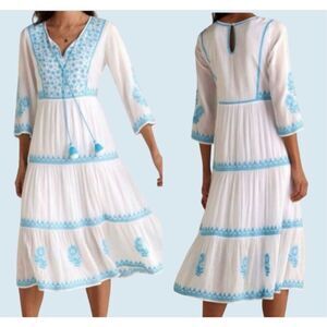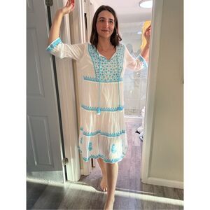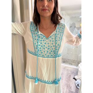 Soft Surroundings White & Turquoise Juniper Embroidered Tassel Dress sz M EUC