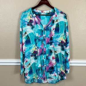 Soft Surroundings Women Top Sz L Blouse Button Up Watercolor Modern Blue Pink R3