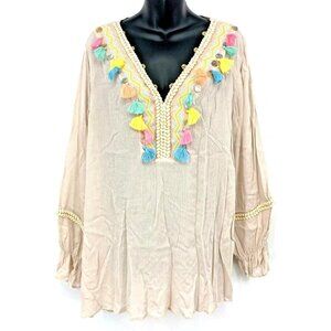 Soft Surroundings Women Top XL Extra Large Ivory Boho Tassel Embroidered V-Neck