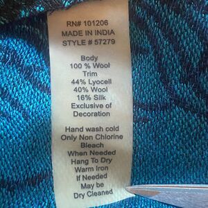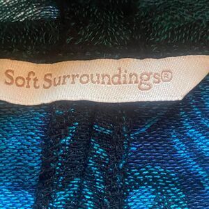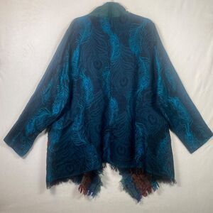 Stunning Soft Surroundings embroidered open-front jacket in size 2X, made in India.Features a richly textured wool body with multicolor floral and paisley embroidery, peacock feather woven pattern on the back, and a softly fringed hem for a bohemian-inspired look. Side pockets.Details:Brand: Soft SurroundingsStyle: 57279Size: 2XMade in IndiaBody: 100% WoolTrim: 44% Lyocell, 40% Wool, 16% SilkColor: Multicolor — teal, turquoise, red, green, and gold accentsFit: Relaxed, open frontFeatures:Embroidered floral and paisley patternFringed hemlineOpen front designMidweight woven wool fabricVibrant peacock feather motif on backCare: Hand wash cold or dry cleanApproximate Measurements (flat, if available — add if you plan to measure):Chest: 26"Length:31.5"Sleeve: 25"Condition:Excellent pre-owned condition — no visible flaws or pulls. Clean, vibrant colors, and ready to wear.