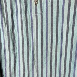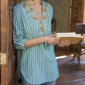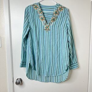 This Soft Surroundings women's blouse in size S features a unique aqua blue striped design with a V-neckline and roll tab sleeves. The top is crafted from brushed cotton material and embellished with beading for added accents. It has a slip-over closure and a rounded hem, making it perfect for casual occasions. The tunic style and classic fit provide a comfortable and stylish option for any season, whether it be winter, summer, fall, or spring. Made in India by Soft Surroundings, this blouse is a versatile addition to any woman's wardrobe.