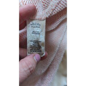 Soft Surroundings beachy terry cloth knit pullover hooded 3/4 sleeve sweater in peachy Pink. Snap button Henley style collar. Side slits