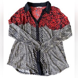 Soft Surroundings Women’s Button Down Patterned Red Black Collared Top, Large