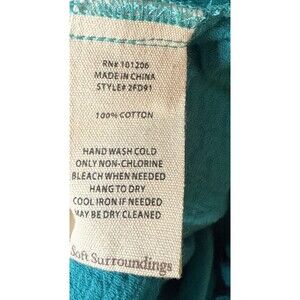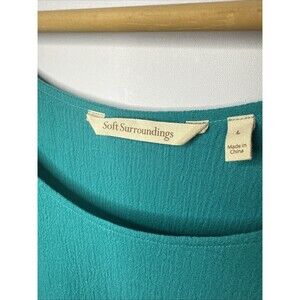 The Soft Surroundings Women's dress in size large is a whimsical and airy piece perfect for the beach or casual occasions. Made from 100% cotton in a gauzy material, this asymmetric dress features a sleeveless design with a round neck and pullover closure. The A-line silhouette and teal color add a touch of fairy-like charm, while the lightweight and lined fabric ensures comfort. Ideal for summer, fall, and spring, this dress is machine washable and designed for regular size women looking for a resort-inspired style.