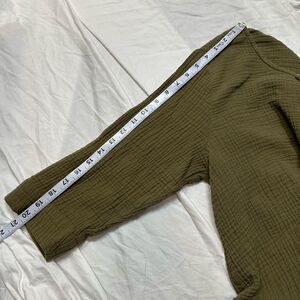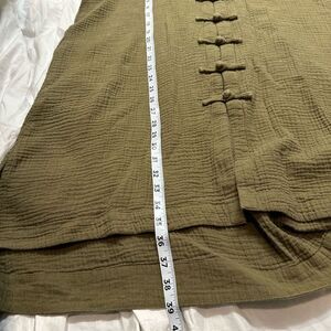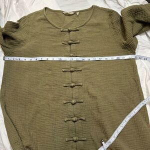 Beautiful olive green tunic style top with 3/4 sleeves. Fabric is slightly ribbed. Knotted and looped buttons down the front.