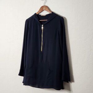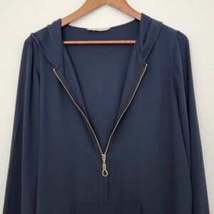 The Soft Surroundings Women's Hooded Sheer Long Sleeve Blouse in size Large is a stylish and versatile top perfect for any wardrobe. With a solid blue color and a trendy zipper accent, this pullover blouse is both comfortable and chic. The hooded design and sheer fabric add a touch of bohemian flair, making it perfect for casual outings or dressier occasions. Easy to care for with its hand wash only instruction, this blouse from Soft Surroundings is a classic and timeless piece that will never go out of style.