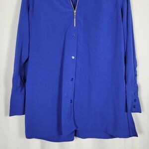 Soft Surroundings Women's electric blue long sleeve tunic top in a size medium. Material is 74% rayon, 14% polyester and 12% nylon. Has a button and zip closure with gold hardware.