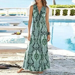 Soft Surroundings Women's Maxi Dress Size PL Blue Paisley Tropical Mint
