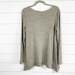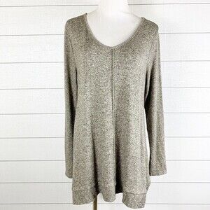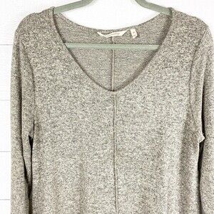 Soft Surroundings Cloud Nine Tunic Sweater Womens Medium Taupe Brushed fine-gauge fabric V-neck, full-length sleeves and ribbed insets at the sides for beautiful drape 74% rayon, 21% polyester, 5% spandex Chest: 38 underarm to underarm, doubled Shoulders: 19 shoulder seam to seam Sleeves: 25 shoulder seam to cuffs Length: 29 Back middle neckline to hem Condition: good pre-owned