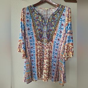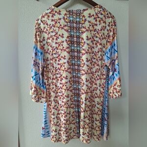 Soft Surroundings Womens Tunic top. Multicolored floral print. Embroidered panel on front. 3/4 Flutter Sleeve. V-neckline. Soft and stretchy. Size L Pit to pit flat lay 21" length from collar to hem 30" measurements are approximate