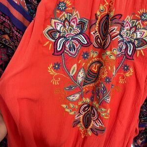 Beautiful bright coral pink/orange with contrasting multicolor sleeves and floral embroidery