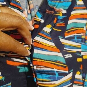 Women’s multicolored, sailboat printed button down blouse by Soft Surroundings, size petite small. Shirt can be considered tunic length, depending on person's height. Lyocell blend shirt has hidden buttons down front; long sleeved. Excellent pre-owned condition; no flaws.