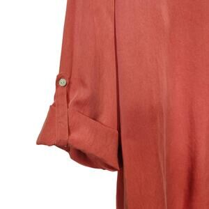 Soft Surroundings women's salmon pink flowy blouse or tunic top. Roll tab sleeves. V Neck. High Low. Mother of pearl buttons and front pocket. 100% Lyocell.