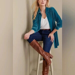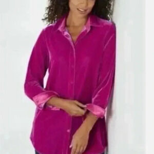Soft Surroundings Women’s Velvet Mint Green Boyfriend Tunic Top button down Blouse. Made from super-soft stretch velvet, this button-down tunic offers both elevated style and everyday ease. The relaxed, longer-length silhouette is cozy and comfortable with jeans or leggings, while plush fabric in rich hues adds a touch of luxury. ****All other colors are sold out***