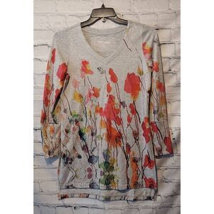 Soft Surroundings Womens XS Poppy Print Tunic Stretch Sweater Pullover Gray Red