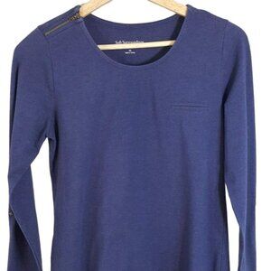 Soft Surroundings heather blue zipper pocket long sleeve top. Round neck with slight scoop. Zipper at right shoulder. Front left pocket. Soft. Excellent pre-owned condition with no stains or tears.