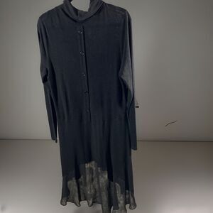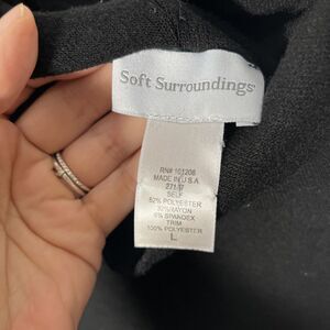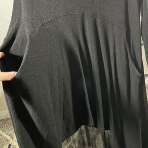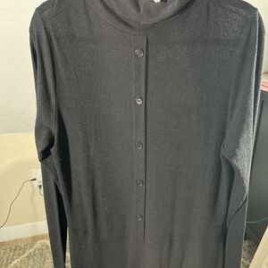 This is a women's black turtleneck sweater dress by Soft Surroundings in size large. It features a button back detail and falls at a midi length. The style is a combination of a sweater and a dress, making it a versatile and cozy option for cooler weather. It has cute comfy front/side pockets (see pics). In excellent condition no flaws Fast shipping. Pet free/smoke free