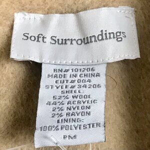 The Soft Surroundings Wool Blend Greenwich Coat Jacket in size Petite Medium is a stylish and classic outerwear option for women. Made from a cozy wool blend material, this long coat features a solid tan color, long sleeves, and a zip closure. Perfect for the winter and fall seasons, this overcoat brings a timeless elegance to any outfit with its knit fabric and sophisticated design by Soft Surroundings. Ideal for petites seeking a versatile and comfortable coat to keep warm during the colder months.