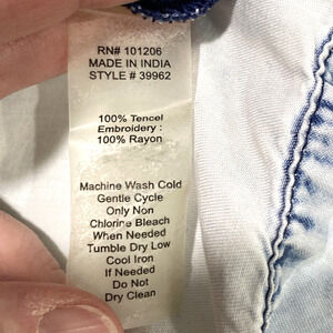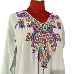 Soft Surroundings Work of Art or Art to Wear popover top - a gorgeous embroidered blue chambray casual look in ladies size PS (small petite). The blue chambray fabric is rayon/tencel with a soft feel and fluid drape - light wash gives a slightly distressed look. V-neck and 3/4-length sleeves. Wear this and wait for the compliments - this is a special look perfect for casual days! Gently worn - no flaws - just stunning!