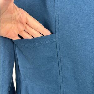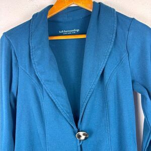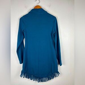 Soft Surroundings Long sweater / cardigan : blazer in the size women's XS. This is an oversized, longer length, relaxed fit with a single button front closure and front pockets. This has fringe detailing on the bottom. It is in a teal blue color. It is in excellent preowned condition with no flaws to note.
