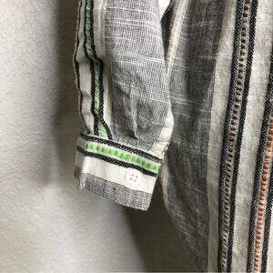 Soft Surroundings black and white striped embroidered popover tunic top. Collared with v notched neckline. Button cuff sleeves with roll tab option. Curved high low hemline. Embroidered floral paisley pattern on front. Double side pockets. Size Petite Small. Excellent preowned condition. 100% cotton.