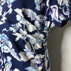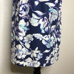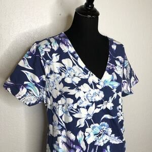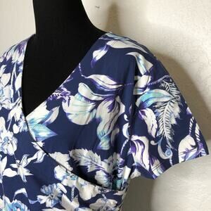 Soft Surroundings navy blue and white floral faux wrap dress. Pullover style with V neckline and faux front wrap. Short sleeves. Size petite XS. Excellent pre-owned condition. Minor wash wear. Cotton spandex blend.