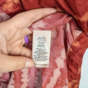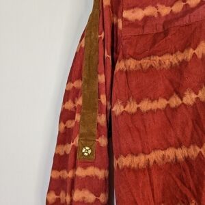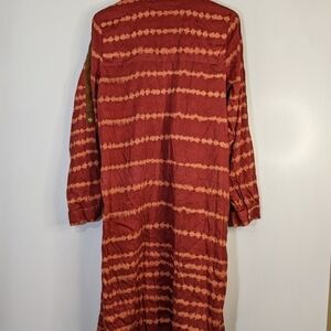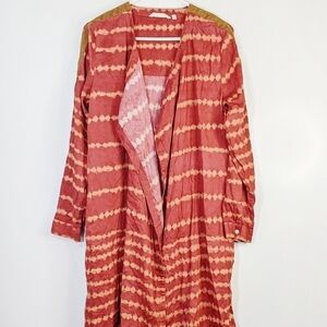 This is a copper and rusty red color tie dye cardigan duster. It is a size women's large. It has button closure sleeves to adjust the length. It is in great pre-owned condition.