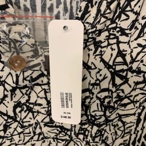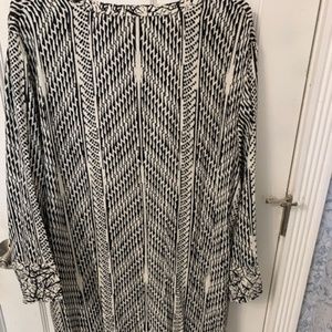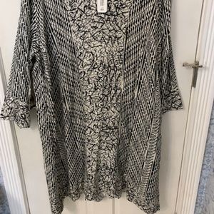 black and cream, tunic style 100% Rayon. Fits small, closer to size 18