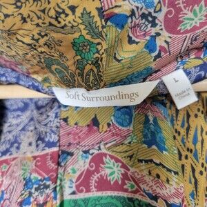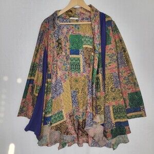 Soft Surroundings lzmur Kimono Topper Cardigan navy gold draped open boho cardigan Women's size Large in excellent pre-owned condition! Please see photos for approximate measurements.