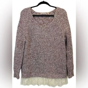 Soft Surroundings marled v-neck cotton blend sweater, size Medium. This chunky knit sweater is long sleeved with a lace hem. It flat lay measures 28” from shoulder to the bottom of the lace hem and 21” pit to pit. There is no damage to this sweater.